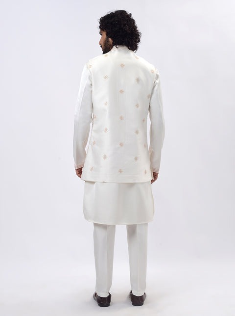 Details: Celebrate special occasions with Azania’s Off-White Kurta Set with Koti. Crafted from a premium silk blend, this set features delicate resham, sequins and diamond work, perfect for gruhshanti and haldi ceremonies. The regular fit and mandarin collar ensure a comfortable and elegant look.
